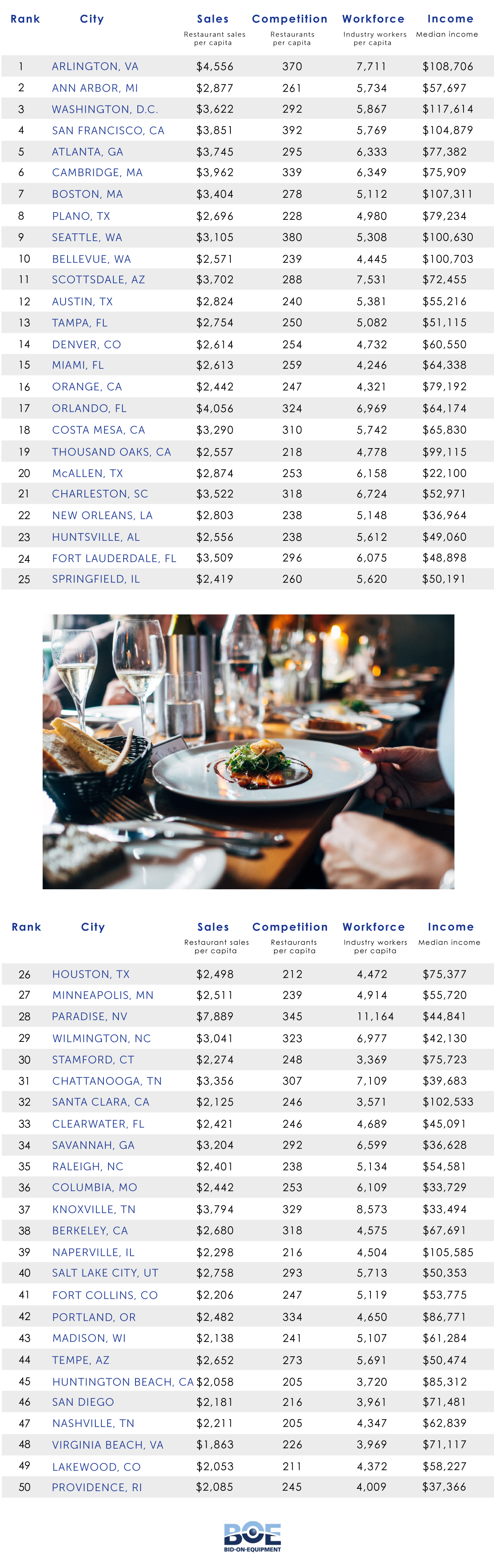 The Washington D.C. area dominates the top of the list with both D.C. and Arlington ranking No. 3 and No. 1, respectively. San Francisco, which is home to the most restaurants per capita, also falls within the top 5. Elsewhere on our list, cities with growing restaurant scenes like Austin, Nashville, and Denver show why aspiring restaurant owners might not want to rule out second- and third-tier cities.